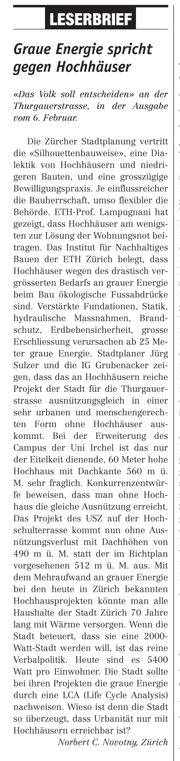 - Leserbrief von Prof. Norbert Novotny / Zürich Nord vom 13. Februar 2020